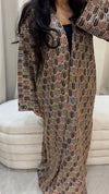 Vom Haus entworfener und von unseren Schneidern in Dubai aus fließendem indischen Musselin gefertigter Kimono. Dieser Stoff ist ideal für besondere Anlässe und bietet einen fließenden Fall, der durch die Perlendetails noch verstärkt wird.