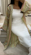 Kimono designed by the House and made by our tailors in Dubai, ideal for special occasions, this fabric offers a vaporous drape, enhanced by the beaded details.