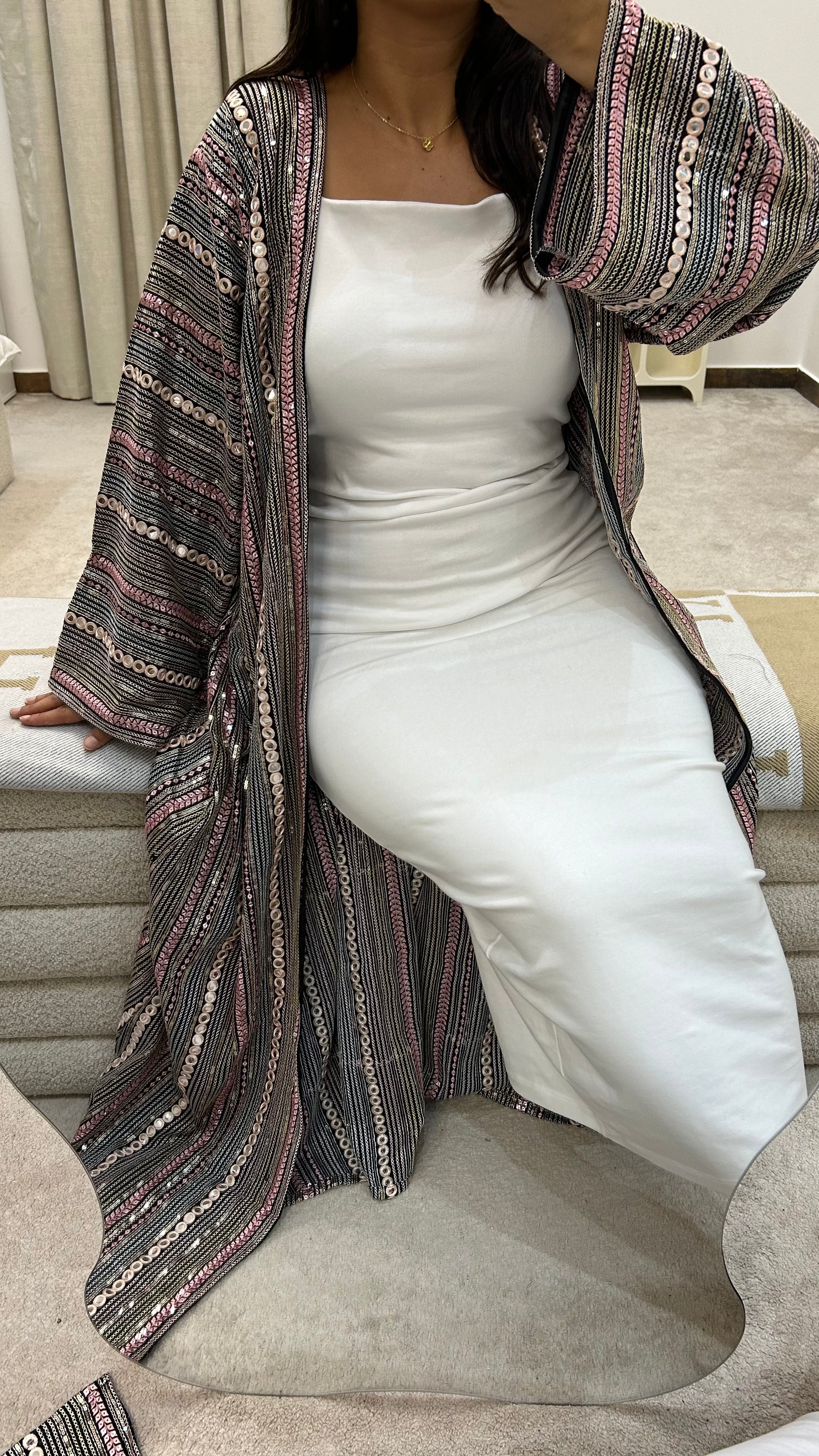 Kimono designed by the House and made by our tailors in Dubai, ideal for special occasions, this fabric offers a vaporous drape, enhanced by the beaded details.