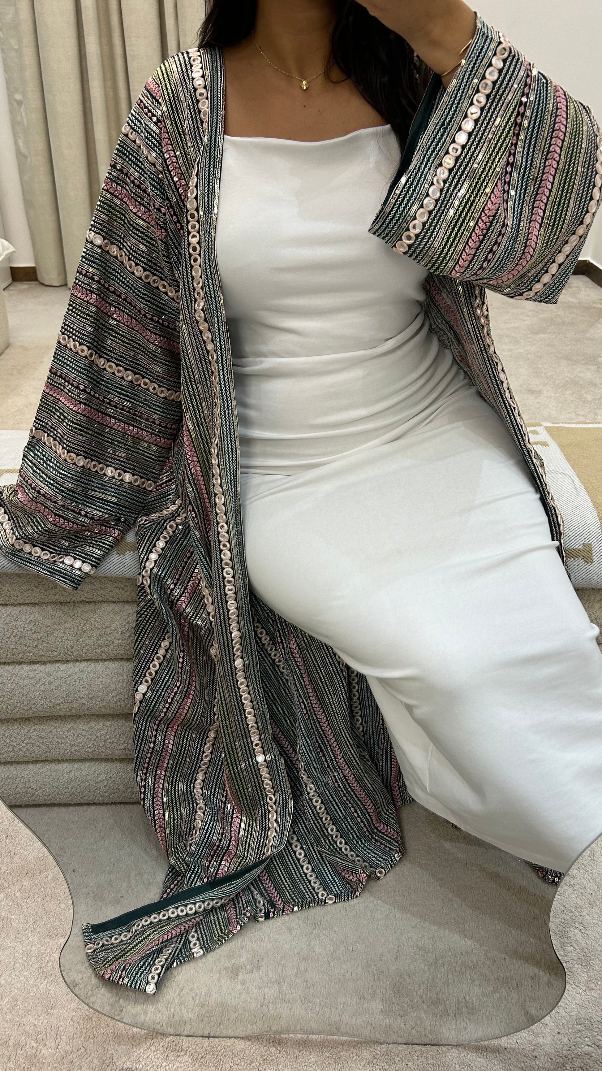 Kimono designed by the House and made by our tailors in Dubai, ideal for special occasions, this fabric offers a vaporous drape, enhanced by the beaded details.