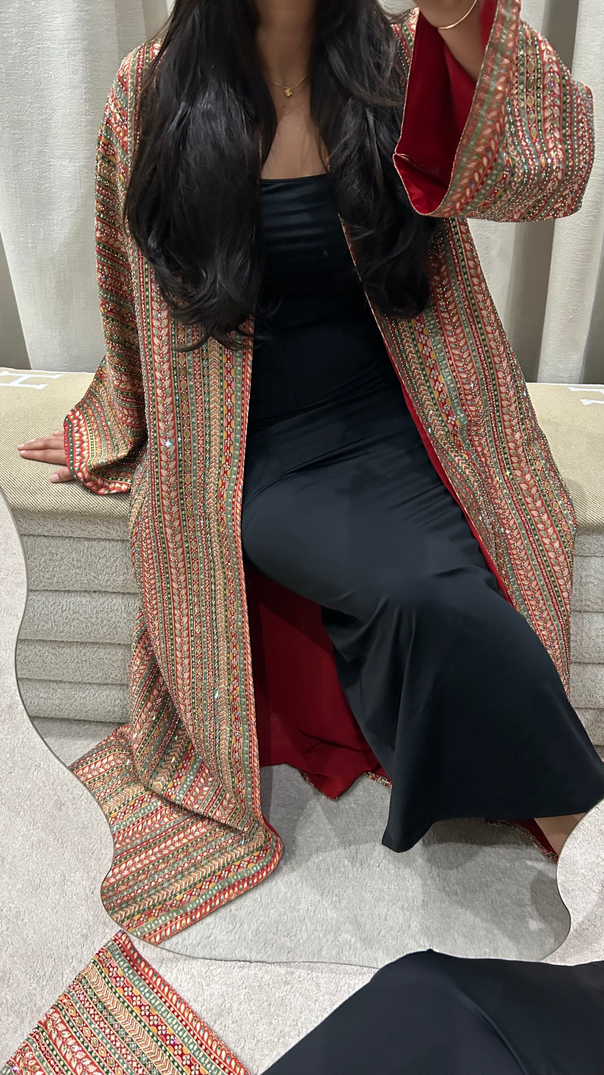 Kimono designed by the House and made by our tailors in Dubai, ideal for special occasions, this fabric offers a vaporous drape, enhanced by the embroidered details on a very high quality fabric called "Jawamar".