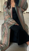 Kimono designed by the House and made by our tailors in Dubai, ideal for special occasions, this fabric offers a vaporous drape, enhanced by the embroidered details on a very high quality fabric called "Jawamar".