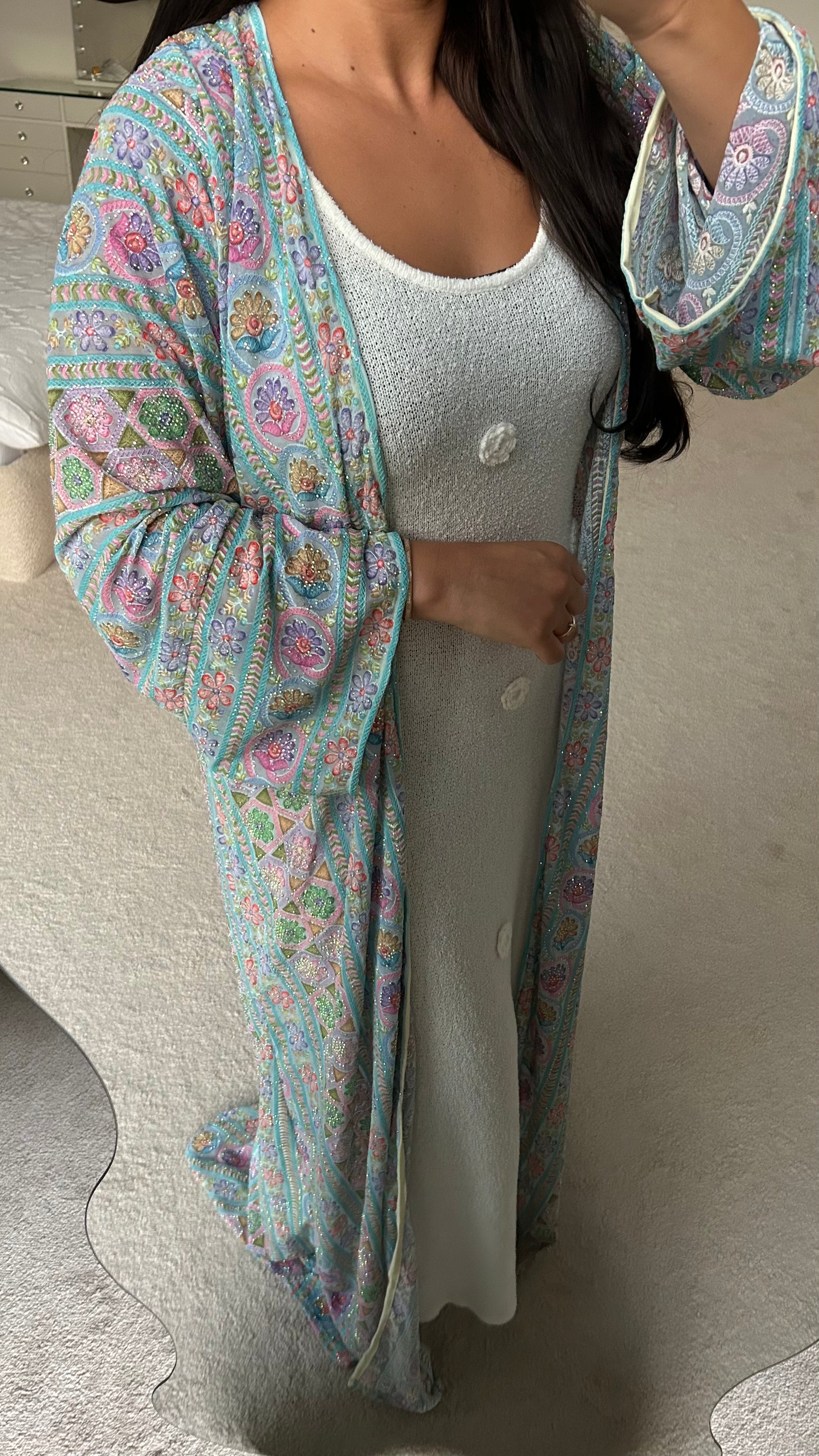 A kimono designed by the Maison and crafted by our tailors in Dubai, from flowing Indian chiffon. Ideal for special occasions, this fabric offers a flowing drape, enhanced by beaded details.