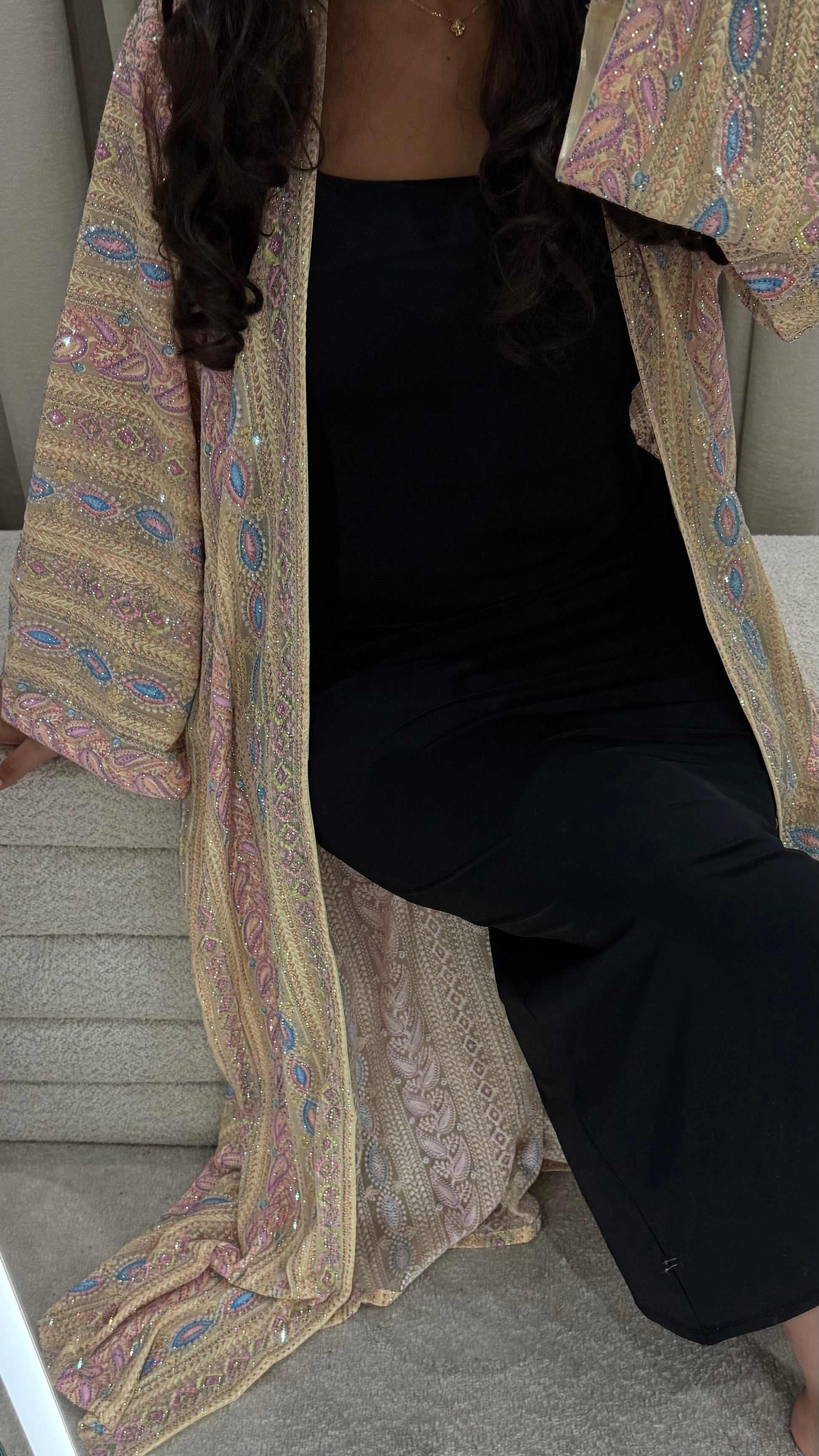 A kimono designed by the Maison and crafted by our tailors in Dubai, from flowing Indian chiffon. Ideal for special occasions, this fabric offers a flowing drape, enhanced by beaded details.