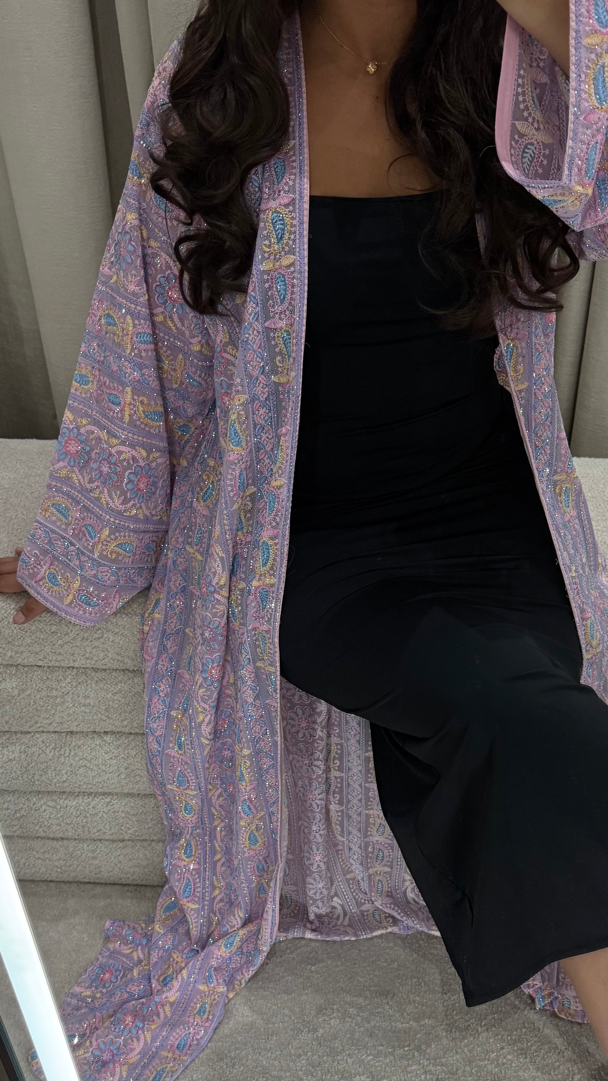 Kimono pensé par la Maison et confectionné par nos couturiers à Dubai, à partir d'une mousseline indienne fluide. Idéal pour les grandes occasions, ce tissu offre un tombé vaporeux, sublimé par les détails perlés.