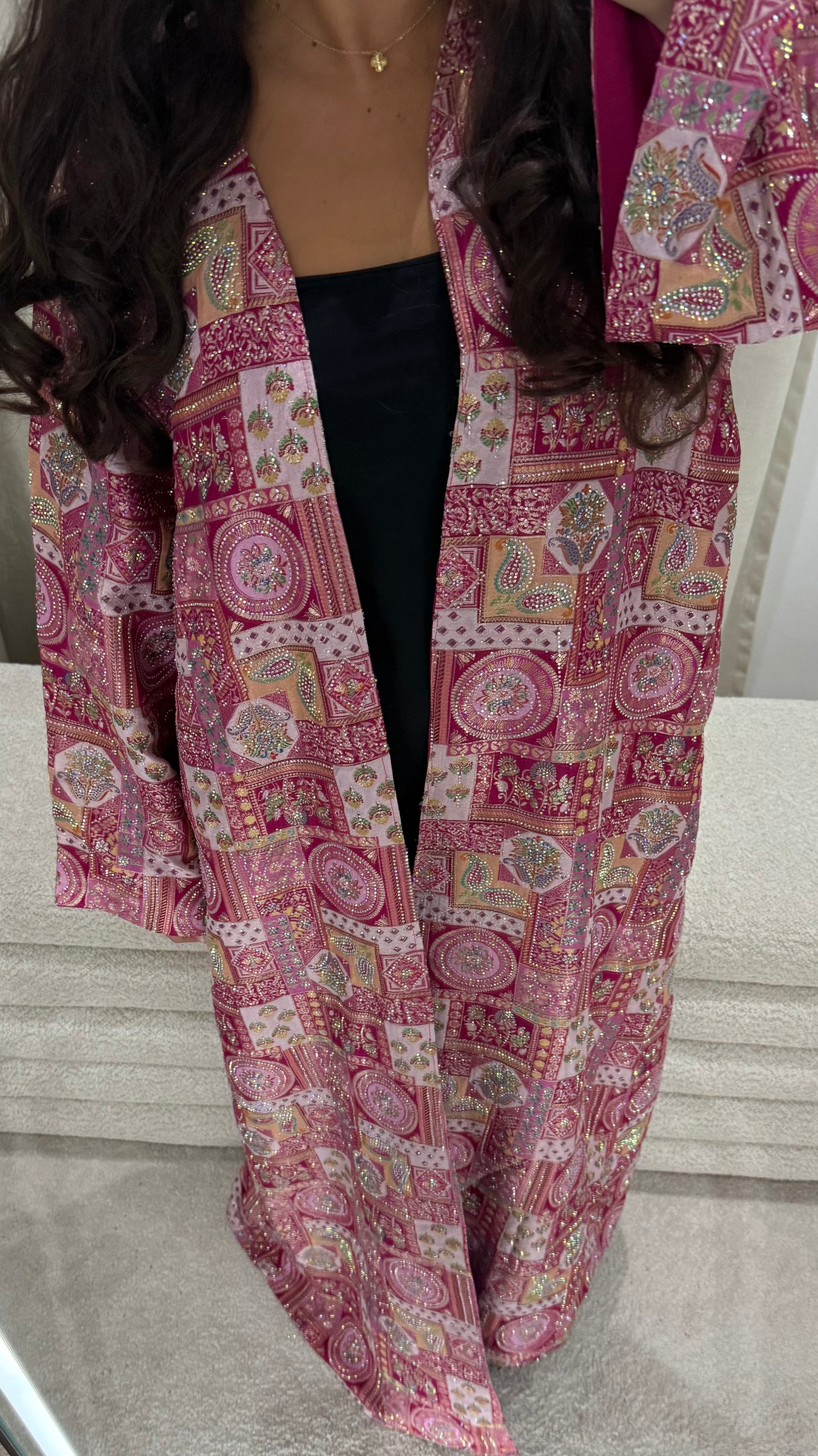 Kimono pensé par la Maison et confectionné par nos couturiers à Dubai, à partir d'une soie brodée fluide. Idéal pour les grandes occasions, ce tissu offre un tombé vaporeux, sublimé par les détails en strass.