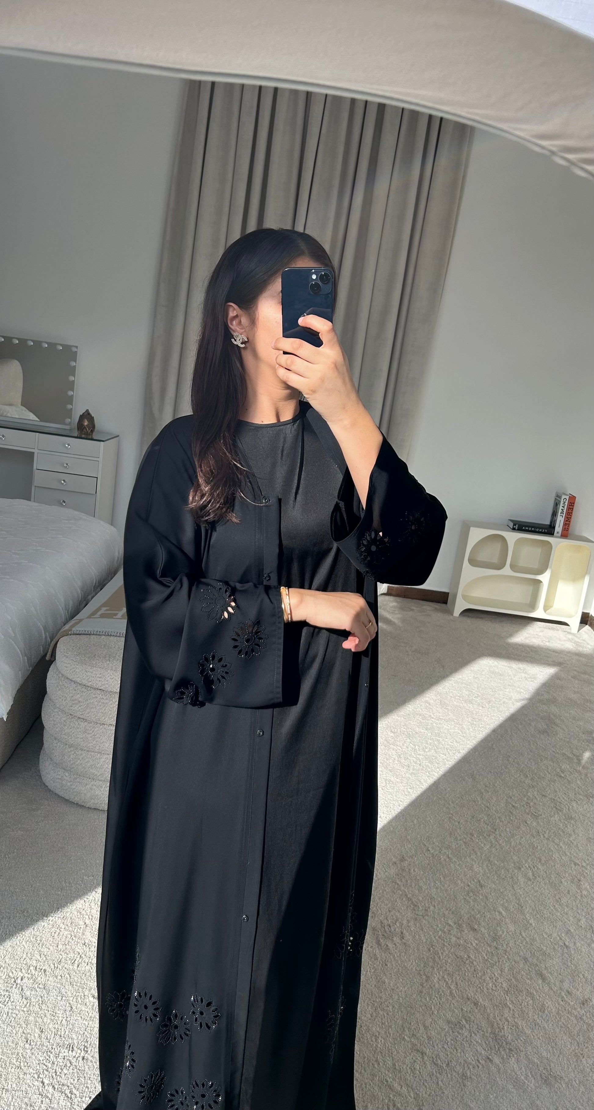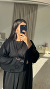 - Abaya with floral honeycombs + rhinestones