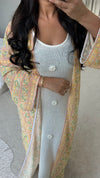 A kimono designed by the Maison and crafted by our tailors in Dubai, from flowing Indian muslin. Ideal for special occasions, this fabric offers a flowing drape, enhanced by beaded details.