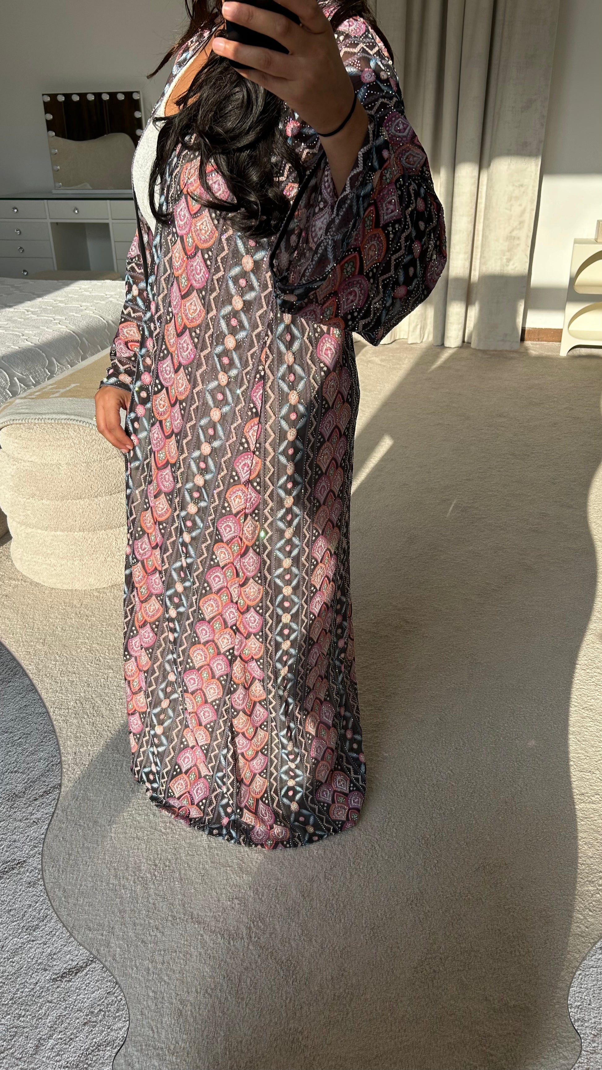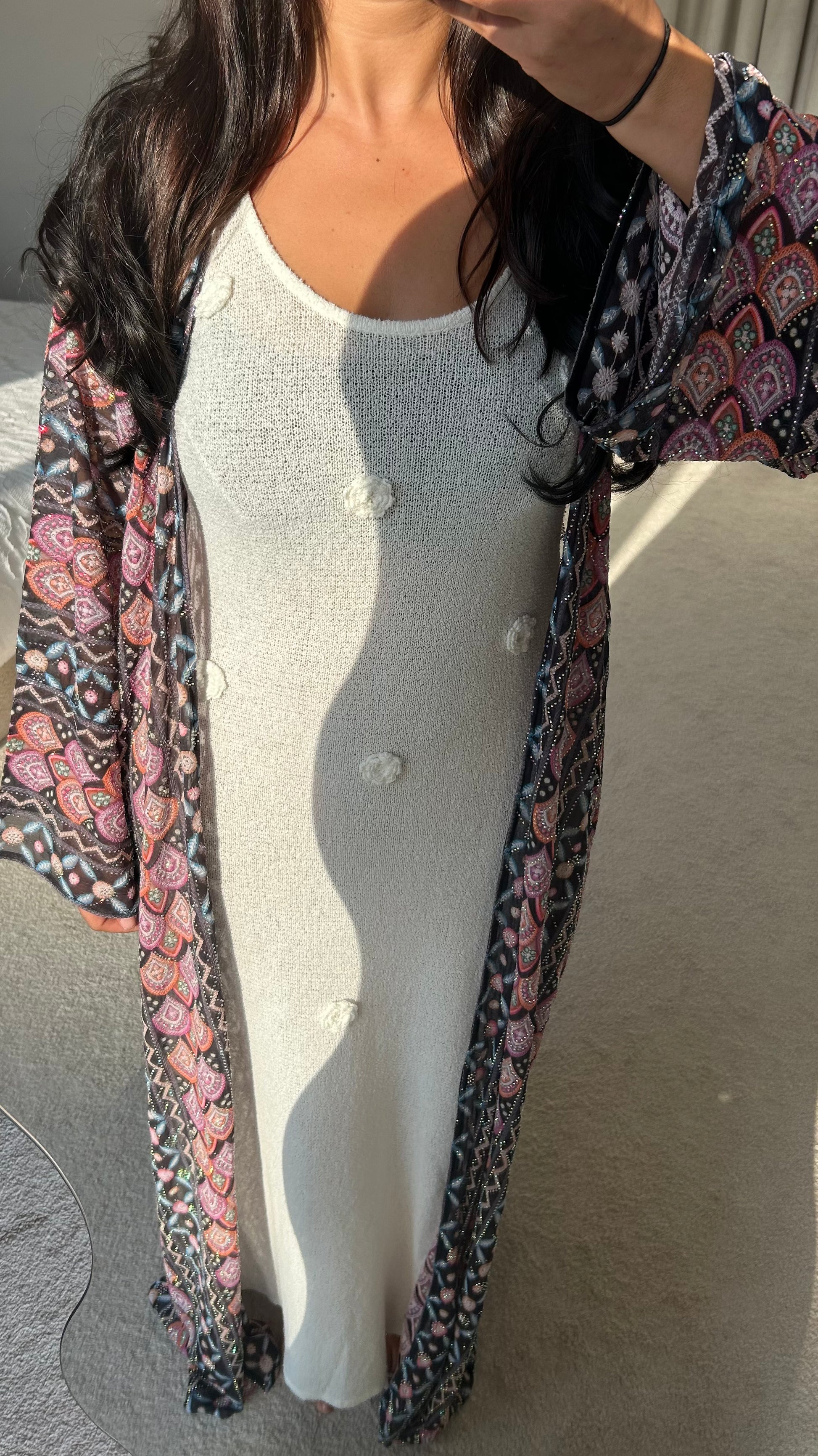 A kimono designed by the Maison and crafted by our tailors in Dubai, from flowing Indian muslin. Ideal for special occasions, this fabric offers a flowing drape, enhanced by beaded details.