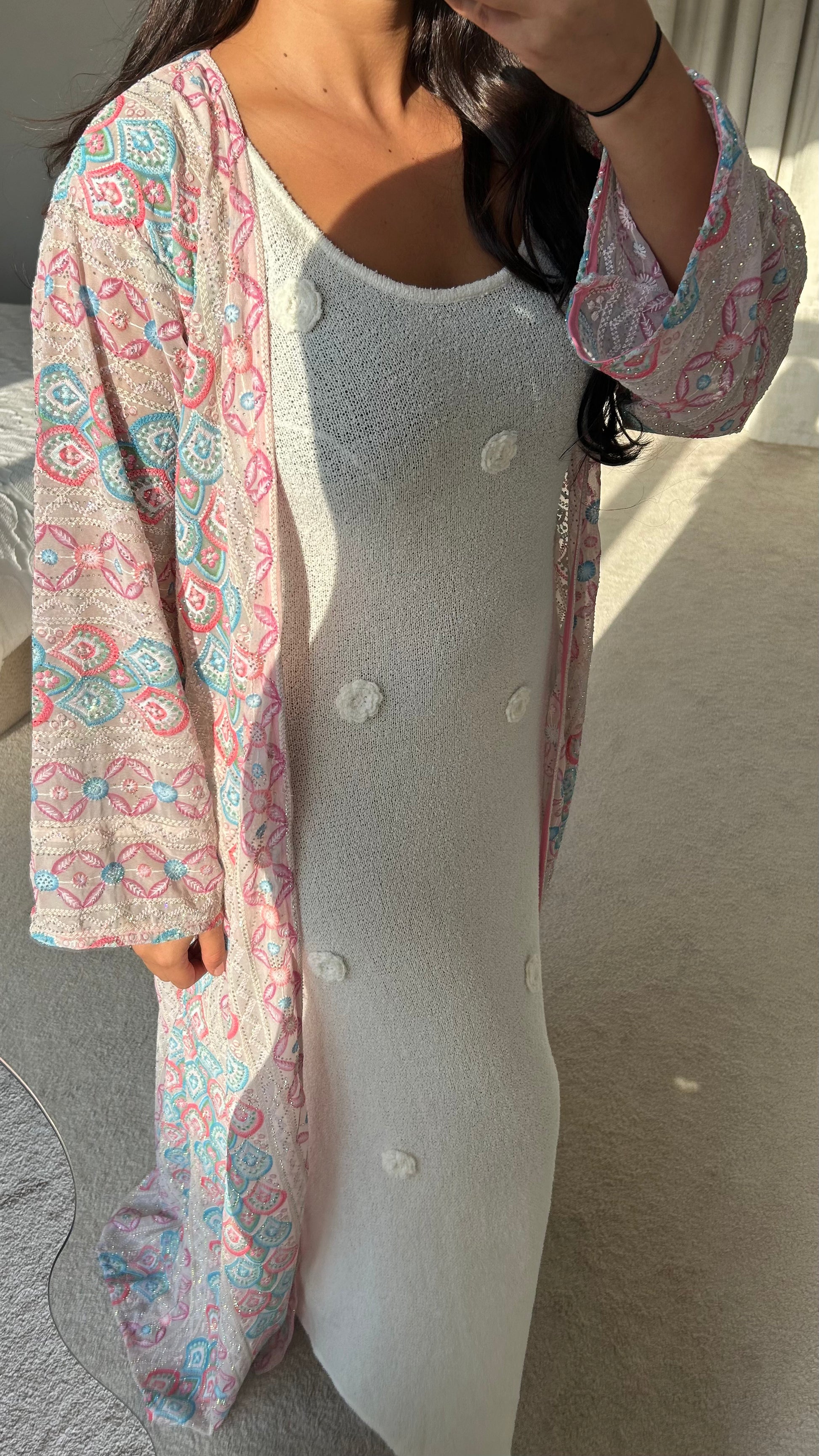 A kimono designed by the Maison and crafted by our tailors in Dubai, from flowing Indian muslin. Ideal for special occasions, this fabric offers a flowing drape, enhanced by beaded details.