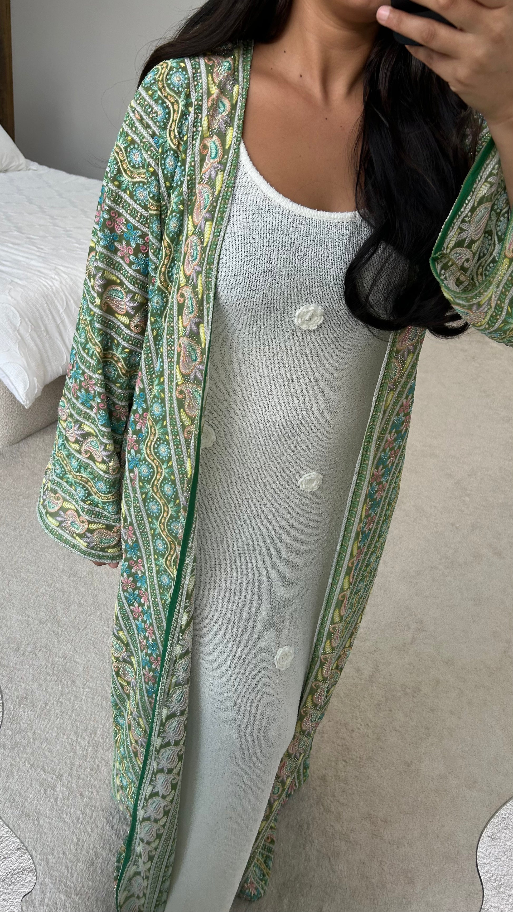 A kimono designed by the Maison and crafted by our tailors in Dubai, from flowing Indian chiffon. Ideal for special occasions, this fabric offers a flowing drape, enhanced by beaded details.
