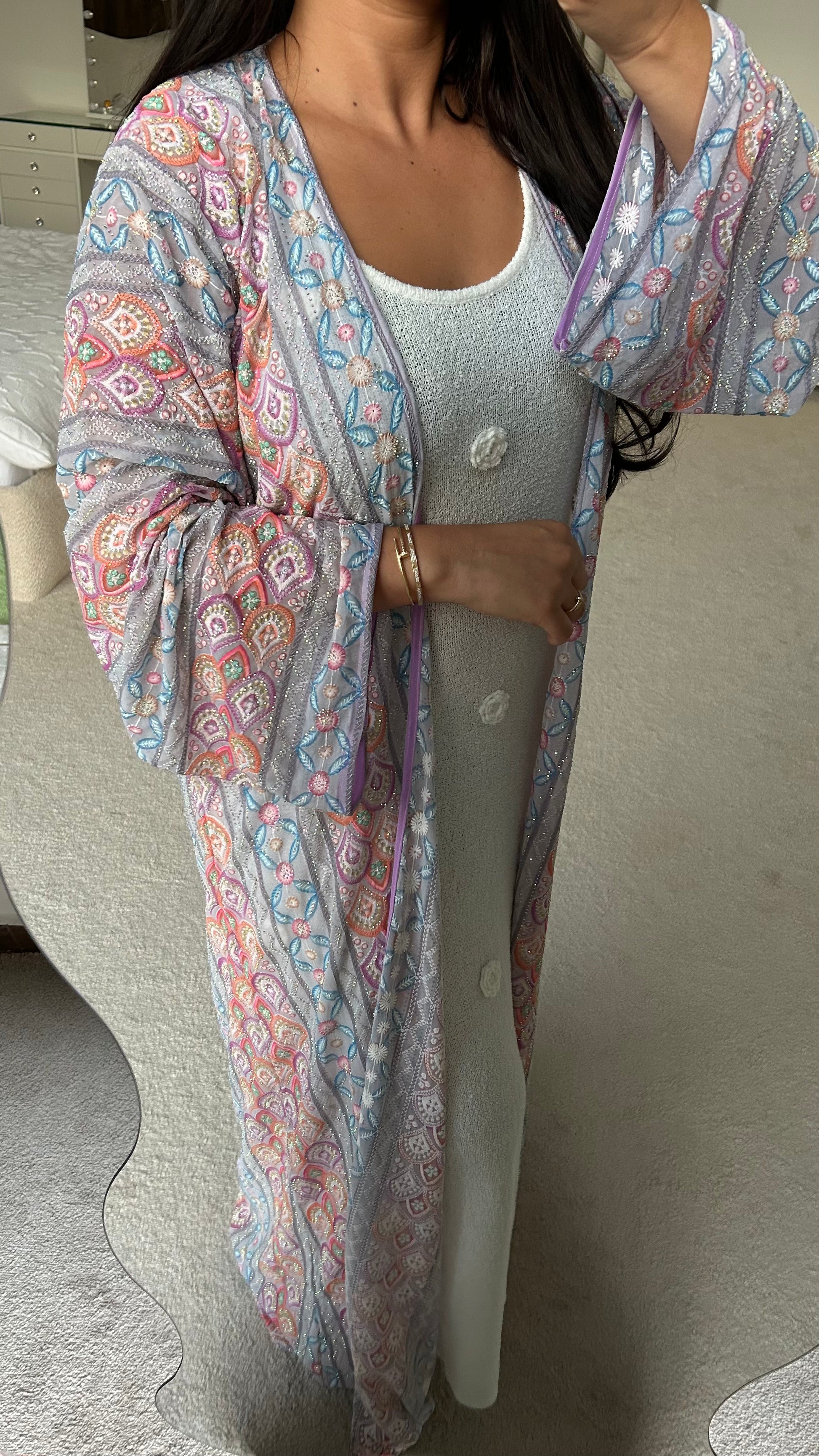 A kimono designed by the Maison and crafted by our tailors in Dubai, from flowing Indian chiffon. Ideal for special occasions, this fabric offers a flowing drape, enhanced by beaded details.